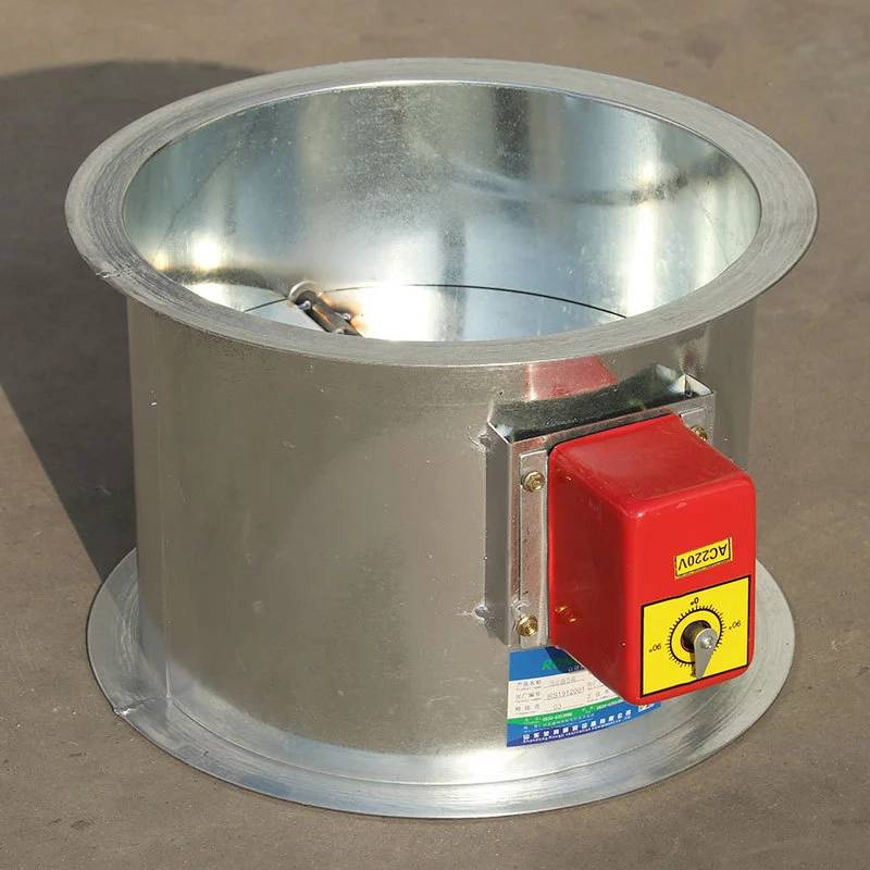 防烟防火调节阀安装在通风和空调系统的管道上,具防烟和防火的要求(以防范烟和火蔓延)。它的功能是:烟雾(温度)电信号联动设备使阀门关闭,通风和空调系统风扇关闭;手动关闭阀门,风扇终止运转;温度保险丝达到70℃时,熔断使阀关闭;输出阀门关闭信号;在五个等于的90°位置调节风量。
